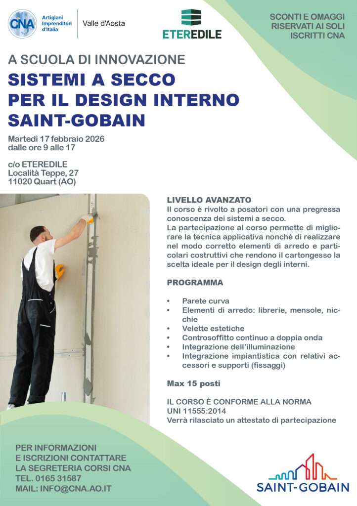 Il secondo appuntamento del ciclo di incontri formativi per le imprese edili organizzati da CNA Valle d’Aosta in collaborazione con Eteredile sarà dedicato ai sistemi a secco per il design interno Saint-Gobain.