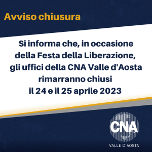 Si informa che gli uffici della CNA rimarranno chiusi lunedì 24 e martedì 25 aprile 2023. Riprenderanno la normale attività mercoledì 26 aprile.