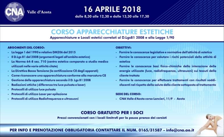 Accrescere la professionalità conoscendo meglio le normative di settore, i principali protocolli e le metodologie per utilizzare e gestire correttamente le apparecchiature: CNA Valle d’Aosta organizza un seminario riservato a tutte le operatrici del settore estetico lunedì 16 aprile, dalle ore 8.30 alle 12.30 e dalle 13.30 alle 17.30, presso la sede di Corso Lancieri 11/F.