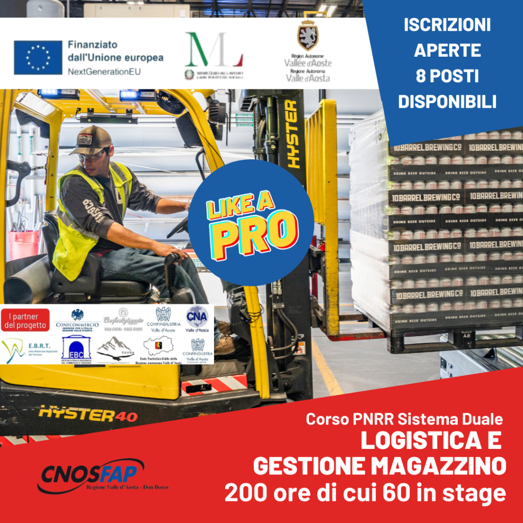 Il Cnosfap di Chatillon intende avviare a partire da Settembre 2023 il corso “Logistica e gestione magazzino – Edizione 1”. Il percorso che sarà erogato a titolo gratuito e finanziato dalla RAVDA nell’ambito del PNRR Missione M5, componente C1 – tipologia “Investimento”, intervento “1.4 Sistema Duale”.