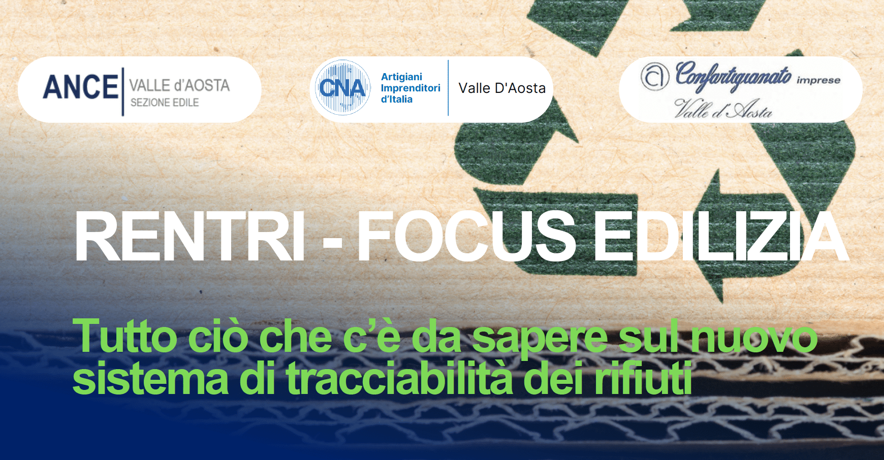 Martedì 11 febbraio a partire dalle ore 9 nel salone Maria Ida Viglino di Palazzo regionale, ad Aosta, CNA Valle d’Aosta, Confindustria Valle d’Aosta e Confartigianato Valle d’Aosta organizzano un corso gratuito sul RENTRI, il nuovo sistema di tracciamento digitale dei rifiuti, finalizzato all’attività delle imprese edili.