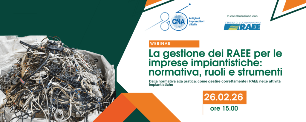 Per fare chiarezza su obblighi, responsabilità e strumenti operativi, CNA Installazione Impianti, insieme al Dipartimento Politiche Ambientali Nazionale, organizza giovedì 26 febbraio, alle ore 15, un webinar di approfondimento dedicato alle imprese del settore, con il supporto tecnico del Centro di coordinamento RAEE.